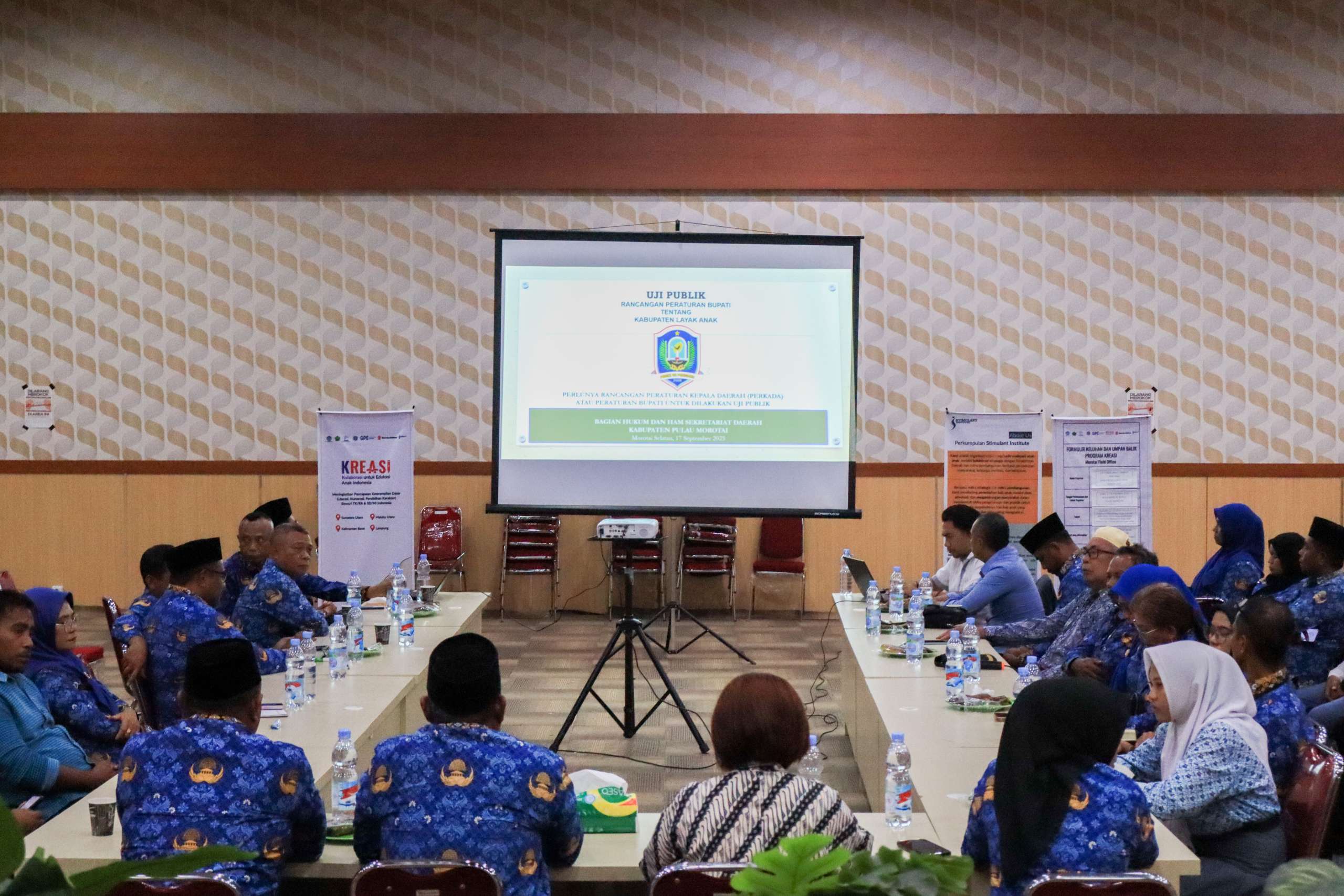 KREASI Morotai yang dilaksanakan oleh Stimulant Institute berkolaborasi dengan Pemerintah Kabupaten Pulau Morotai menyelenggarakan uji publik terhadap rancangan Peraturan Bupati (Perbup) tentang Kabupaten Layak Anak (KLA) pada Rabu (17/9/2025). Kegiatan ini merupakan tindak lanjut dari proses pengkajian ulang Perbup KLA, yang telah disesuaikan dengan Peraturan Presiden (Perpres) No. 25 Tahun 2021 dan PermenPPPA No. 12 Tahun 2022 sebagai rujukan utama dalam penyelenggaraan KLA di tingkat daerah.