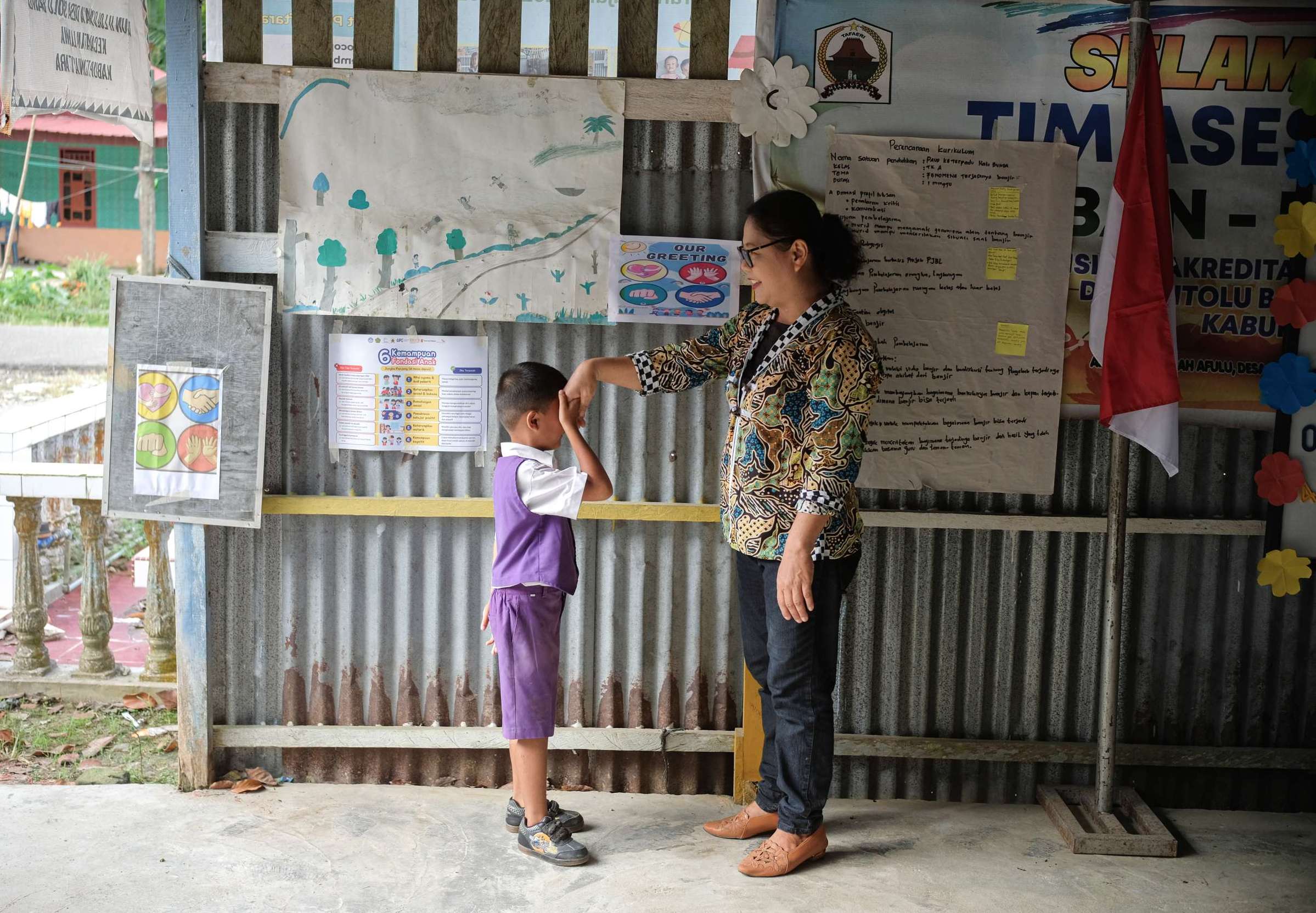 Sekolah itu berada di tepi jalan—ruangan sederhana berukuran sekitar empat kali enam meter yang setiap pagi berubah menjadi kelas, dan setelahnya menjadi garasi kendaraan keluarga. Sebelum anak-anak datang, Murniati dan guru lain selalu memastikan ruang kecil itu bersih, disapu, dan disusun kembali layaknya ruang belajar sungguhan.